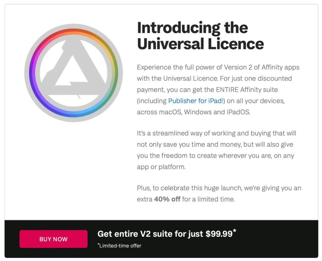Bayangkan dengan paket diskon 40% diharga $99 (setara 1,5juta lebih sedikit) kita bisa dapat 3 aplikasi (Affinity photo, designer, publisher) untuk 3 jenis gadget. Bisa digunakan di windows,mac dan juga ipad. Jadi kalau untuk seperti saya yang menggunakan windows ketika di rumah, dan mac ketika bepergian.
