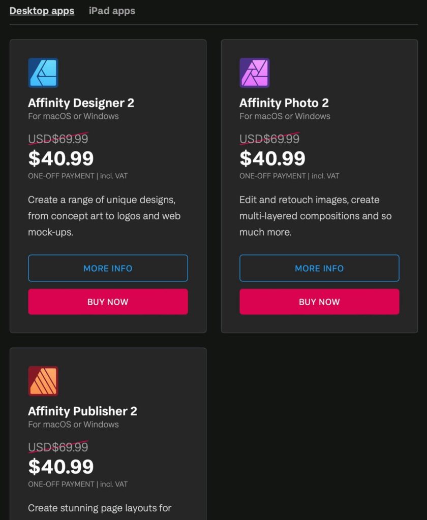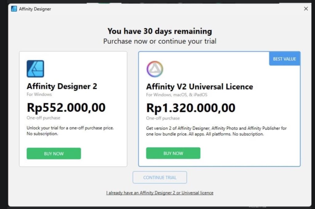 Salah satu unsur yang menarik dari Affinity dibandingkan Adobe tentunya memang di harga. Dengan sekali bayar, kita tidak perlu lagi pusing dengan biaya bulanan. Bahkan beberapa kali promo 40% untuk pembelian produk produk Affinity membuat perbandingan menjadi tidak masuk akal. Dengan harga normal per aplikasi Affinity di kisaran 700 ribu dan ketika promo bisa hanya 400 ribu, dibandingkan dengan aplikasi di Adobe yang dibanderol sekitar 280rb an setiap bulan. Jadi dengan dua bulan langganan aplikasi Adobe sudah bisa mempunyai aplikasi alternatif sampai nanti keluar versi yang lebih baru.