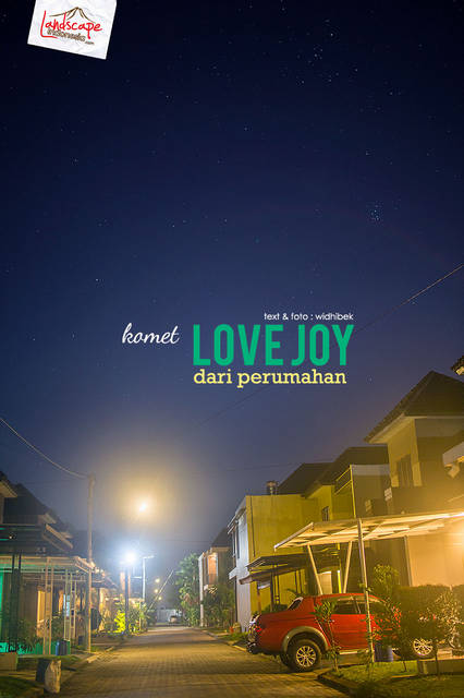 Pemberitaan mengenai komet Love joy sebenarnya sudah saya dengar dari bulan Desember 2014 lalu. Tapi karena sampai awal Januari banyak berkeliling jadi tidak fokus untuk menyaksikan salah satu keindahan langit ini. Setelah sampai di Solo juga lebih banyak selepas mentari terbenam kalau tidak mendung, rintik hujan atau malahan hujan deras sepanjang malam. Tapi tadi malam memang sedang beruntung, langit cerah, bintang bersinar menghiasi malam. Awalnya saya malah dapat telpon dari kakak, “Wid, langite cerah lho, bintang okeh, komet love joy ne sebelah ndi?” (Wid, langitnya cerah lho, bintang nya keliatan banyak, komet love joy nya di sebelah mana ?). Dan saya pun bergegas beranjak dari depan laptop keluar rumah, melongokan kepala ke langit dan kembali masuk rumah, dan keluar lagi dengan tripod, kamera dan kabel rilis di depan teras 😀
