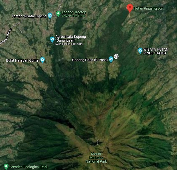 Setelah memutari beberapa lokasi di google maps, menemukan posisi hutan pinus Kayon yang berada di timur laut Merbabu sepertinya lokasi yang sesuai. Buka google earth untuk memastikan posisinya, sepertinya milky way tidak terlalu tepat di atas puncak gunung Merbabu, tapi agak berada di sebelah kanannya.