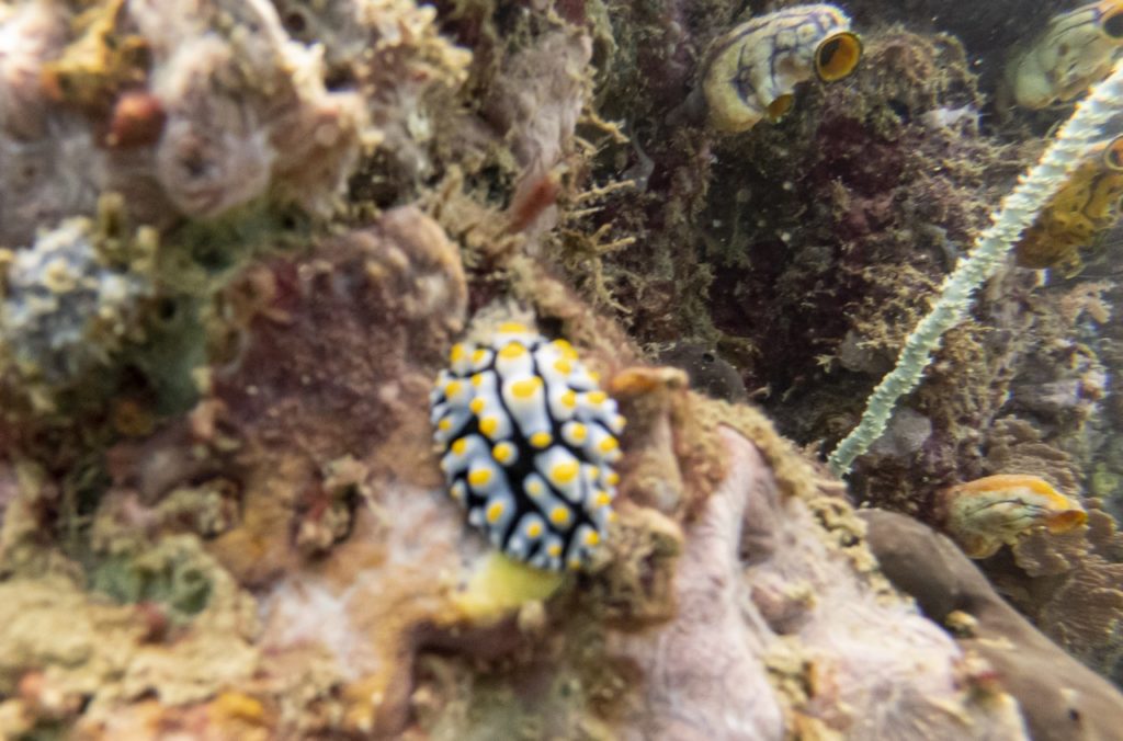 Di satu sisi, di permukaan karang yang sudah sedikit rusak, ternyata ada satu nudi branch yang melenggak lenggok diabadikan kamera.