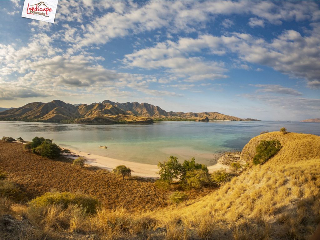 Di belakang kami pemandangan pantai dengan latar belakang siluet pulau Komodo. Saya terpesona menyaksikan perbedaaan pemandangan dari pinggir pantai dengan bukit yang tidak terlalu tinggi ini. Beda, dan saya suka.