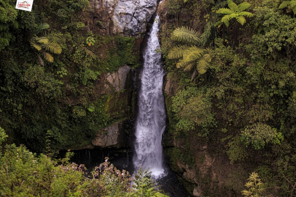 Kami menuruni jalan yang sudah dibeton, bertangga. Di depan kami sudah terlihat air terjun yang berada di sisi sebalik, terpisah jurang.