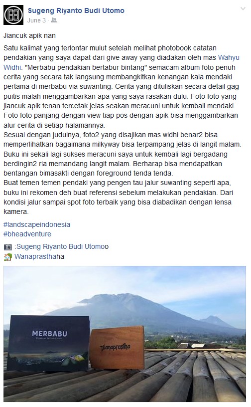 Beberapa ulasan buku Merbabu : Pendakian Bertabur Bintang dari teman-teman yang sudah membacanya. Terima kasih sudah berkenan menuliskan ulasan buku Merbabu. Jadi bikin lebih bersemangat untuk terus berkarya mendokumentasikan keindahan pelosok negeri Indonesia melalui foto dan tulisan euy. Ditunggu ulasan buku Merbabu dari teman-teman lainnya ya.